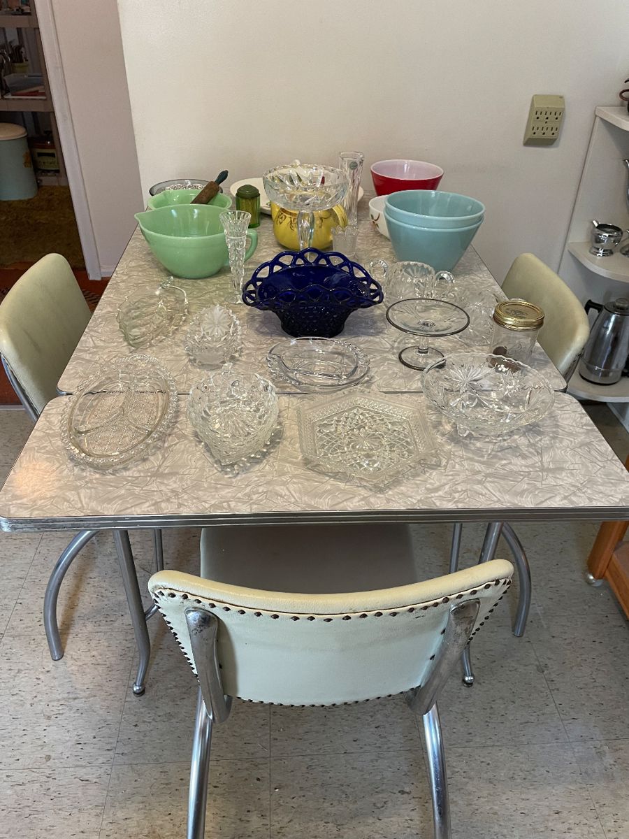 Dearborn Heights Estate Sale Featuring: Jadeite Pyrex Costume Jewelry/Trinkets/Boblo Lighter Framed Stained Glass Art Fireplace Screen Banjo Clock Le Coultre Clock (GAF Corp) MCM String Art Pictures Bedroom Set/Bed/Vanity/Dresser/End Table Secretary Desk Mirrors Brass Student Lamp with Yellow Globes 1940's Weeping Gold Tidbit Tier Tray Wooden Snack Tables MCM Hair Pin Legs Desk Vintage Christmas Wooden Ship w/Sails MCM Sofa Console Tube Radio Speed Queen Wringer Washer 50's Kitchen Table Tool Room in Basement/Wood Worker Garage/ Tools Yard Tools Much, much more..see you soon!!