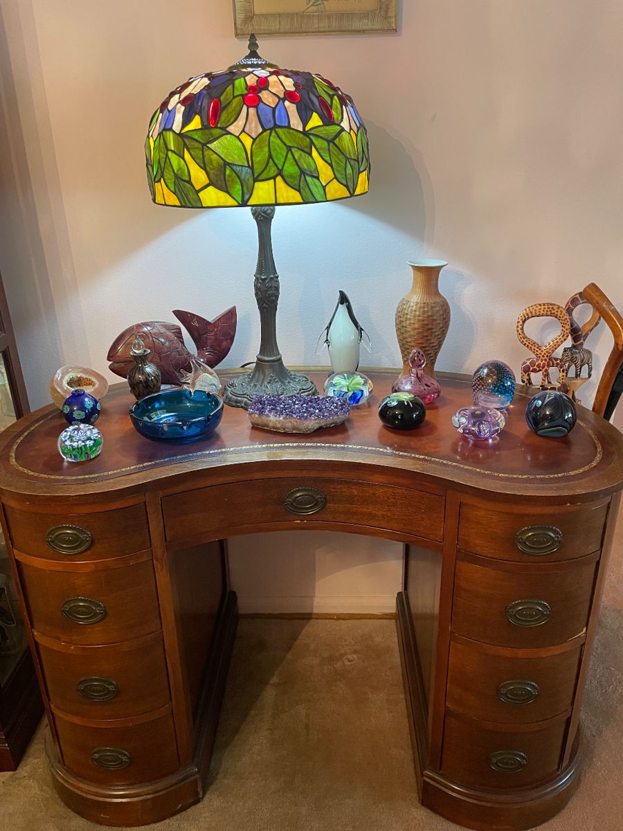 River Rouge Estate Sale Kidney Shaped Desk is NOT FOR SALE Paperweights Tiffany Style Lamp Shades/Bases Lladro Murano Glass Angels Framed Art Henredon Dining Room Set Silver Plate Crystal Fenton Crystal Decanters Oil Painting by Groll Wooden African Art/Baskets Vintage Clothing/Coats Purses/Shoes/Hats Trundle Bed Wicker Hamper/Cabinet Perfumes Designer Eye Glasses Linene/Blankets Kitchen Table/Chairs Flat Screen TV Sango Dishes Cookware Utensils Buffet Luggage MCM Bar Stools MCM Artificial Planter Mirrors Fainting Couch MCM Wall Unit/TV/Stereo Books/DVD's/CD's Folding Chairs Teapots MCM Crackle Base Lamp Danbury Mint Michelle & Barack Obama Dolls 70's Mushroom & Butterfly Wall Hanging MCM Lava Lamp Barware Cleaning...