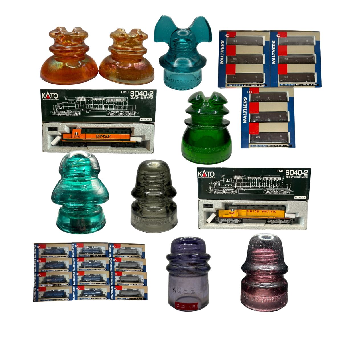 Lots of great HO Scale model train locomotives and cars. Great selection of unique and common glass Insulators!