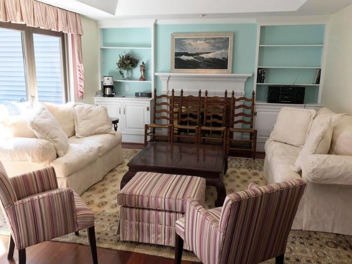 Custom furnishings, decorative items and more including sofa and pair of love seats by Rowe, 4 ladder back dining chairs, upholstered chairs, oriental style server, mahogany server and 3 piece China cabinet, coffee and side tables, oriental and other area rugs, mirrors, framed artwork, desk, 4 piece bedroom suite by Nicholas and Stone,( triple dresser, tall chest and 2 night stands,) upholstered queen headboard, armoire, lamps, dresser, twin beds, linens, flatscreen tv's, China and glass, kitchenware and cookware, small appliances, outdoor patio furnishings, Weber grill, landscaping items, garden tools and more.