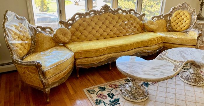Meticulous Estate Home......BID with confidence! Auction begins to close Saturday evening 9PM. Next day pick up, Sunday May 9th, 10am-1pm sharp. .Vintage ornate French Provincial Style 3 piece sofa with custom fabric. .Vintage 1980's Large Lucite Chandelier .Vintage Mid-Century Red table lamp .Vintage ornate Dining room table with 6 custom fabric covered chairs .Vintage outdoor assorted garden statuary and outdoor cast iron chairs .Vintage framed & signed Horse Racing Painting on canvas .Vintage double pedestal ornate marble top coffee table with matching end tables .1980's Round metal and glass dining table with chairs .Vintage matched pair of ornate metal filigree...