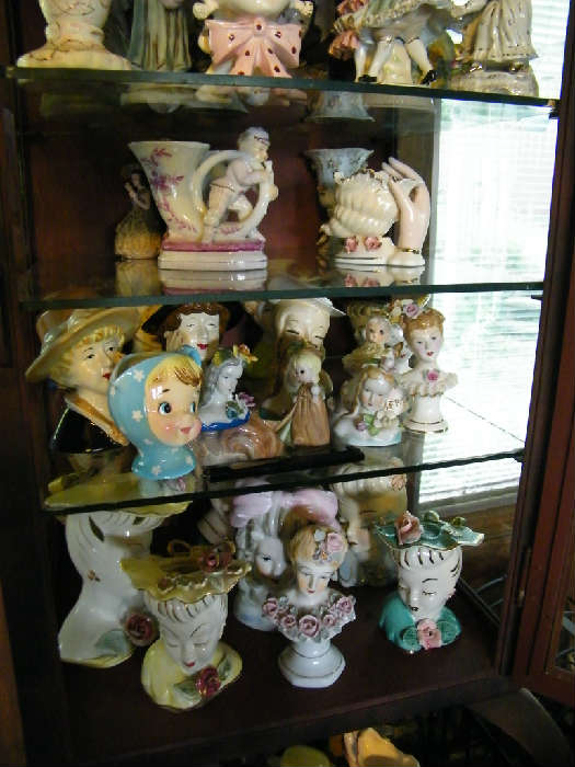 This is a lifetime collection of antiques and collectibles to include a large collection of pottery and porcelain figurines large collection of head vases, from the early 1900's to the 1960's., Whimsical and fun. Exceptional Ashley Furniture Dining Room set to include a dining table with six chairs in Queen Anne style carved legs and claw and ball feet, Matching Secretary, ladies writing desk, and two 6ft curio cabinets. Antique tubular brass bed with applied floral decor, oak side by side-two one is a repro the other early 1900's oak with leaded but needs work, Shabby sheik style decorative, statuary...