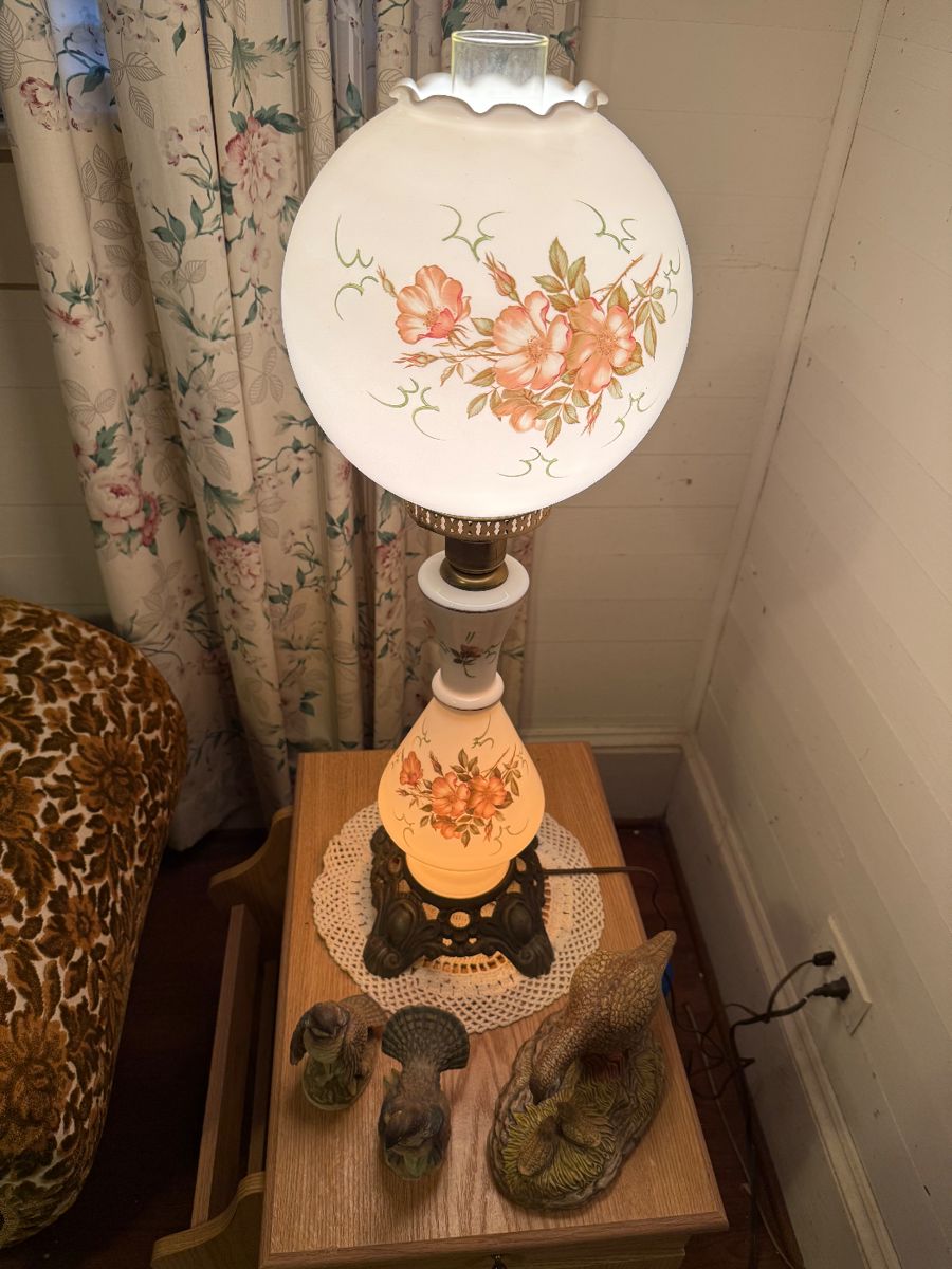 This is a small house but we are full. We have glassware, old stand mixers, Furniture, lamps , vintage pcs of clothing. Some never been out of the Christmas boxes they were given in, we have ladies old hats, some men’s hats, a like new Lift Chair. A fainting sofa, a Housier cabinet. Metal glider and chair that matches. Wardrobes, Ladies clothing and jewelry. An electric stove, a chest freezer and much more. Come out and see us.