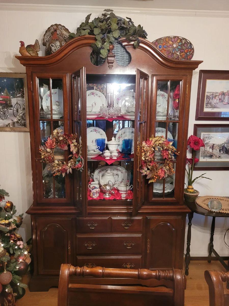 The house and shed is packed full. There are many Christmas items. Not only is there Christmas items, there is also many items from other holidays too. There's also several pieces of furniture. Three beds, dressers, chest of drawers, beautiful dining room table and chairs, China cabinet, curio cabinets, halltree, lazy boy chair, roll top desk, wood filing cabinet, many lamps, mid century items, lots of kitchen items, collectibles, 3 sewing machines, lots of, thread, lots of jewelry, lots of women's clothes, handbags, and shoes. Bottles of expensive Parfums, men's clothing and hats. Several pieces of artwork, record albums, cds,...