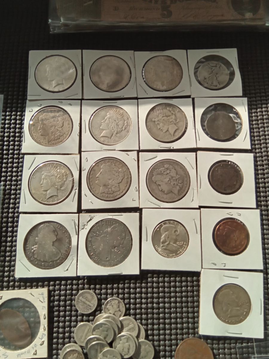 This sale is the combination of three Estates at our Historic Warehouse in Chatom, Alabama. The sale consist of Antique Silver Dollars - Peace & Morgan, Original Civil War Confederate Currency, Federal Reserve Bank Notes, Fractional Notes, Spanish Silver Reales 1799 -1803, Silver Certificates, U.S. Large Cents, Indian Head Cents, Mercury Dimes, Buffalo Nickles, Military Challenge Coins, Walking Liberty. 50, Franklin .50, Military medals, Military Buttons, Military wings, Militaria patches, WW2 Bayonet, Civil War memorabilia, Civil War bullets, Badges, Historical pins, Vintage Colt 45 pistol clip, Comics, Delft Blue, Antique silverware, Northwood glass, Art, Music Memorabilia, Agate Chess set, Alabama...