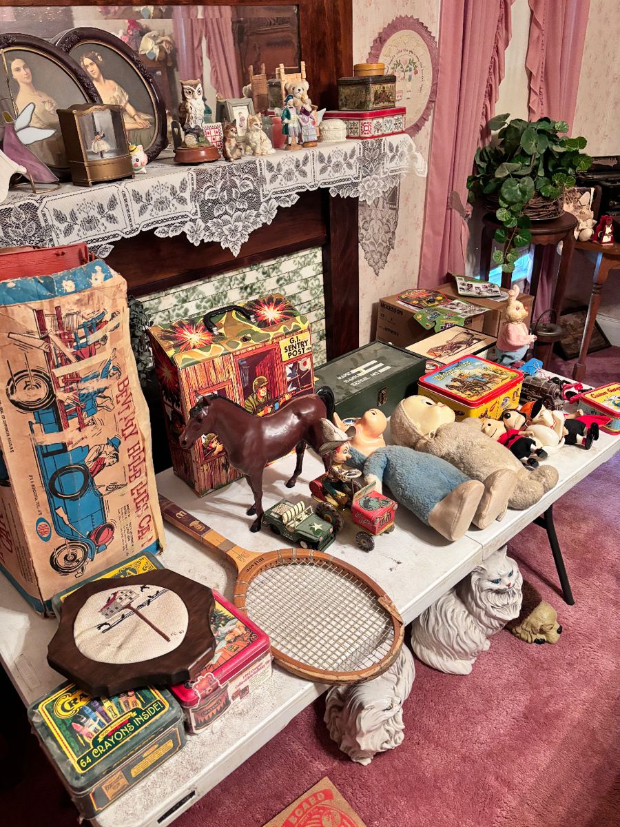 1912 farmhouse and shop/sheds FULL of antiques/rare finds! 2 antique oak high headboard beds, antique toys, glassware/china sets, antique Coca-Cola 24” button sign in great condition, antique Pepsi thermometer, cast iron skillets/kettles, washer, dryer, electric stove, beautiful antique oak buffet, oak farmhouse, many sets of oak dining tables, tons of old bottles/jars, crocks/churns, TONS of old books (from 1800’s-), antique knives, small kitchen table, lots of beautiful quilts, many oak curio cabinets, Antique hall tree, oak wood/glass display case, microwave, Tupperware, small kitchen appliances, wood dressers/chest of drawers/side tables, lamps/home decor, TONS of sewing notions/fabric/threads, TONS of magazines (Birds &...