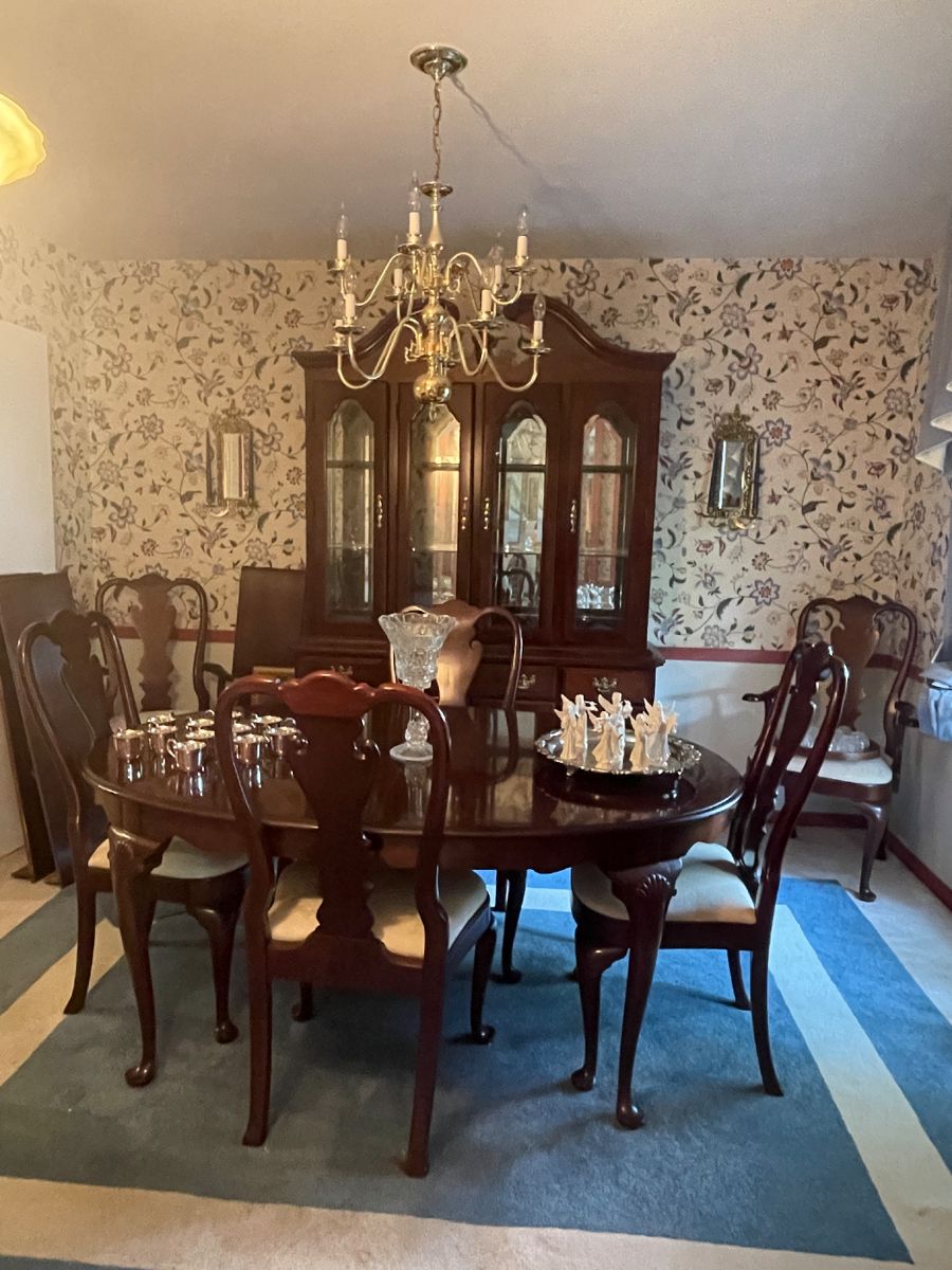 GET GREAT DEALS ON BEAUTIFUL VINTAGE FURNITURE, MUSICAL INSTRUMENTS, SILVERPLATE AND COLLECTABLES AT THIS SALE! CONTENTS MUST GO BY SATURDAY 1PM. EVERYTHING IS OFFERED FOR PURCHASE BEFORE DATE OF SALE. PLEASE CALL FOR AVAILABILITY. YOU MUST BRING YOUR OWN PACKING, TOOLS AND HELP TO MOVE ITEMS. Swarovski, Christian Dior and other costume jewelry; Several 12/14 karat necklaces and earring. Matching Lexington Cherrywood dining table w/3 leafs, 6 chairs and china cabinet. Serving Cart; International silverplate tea/coffee set, serving pieces, bowls, trays, ice bucket. White full canopy bed w/end table, chest, dresser/mirror, rocking chair and desk. Nice set! King pine headboard...