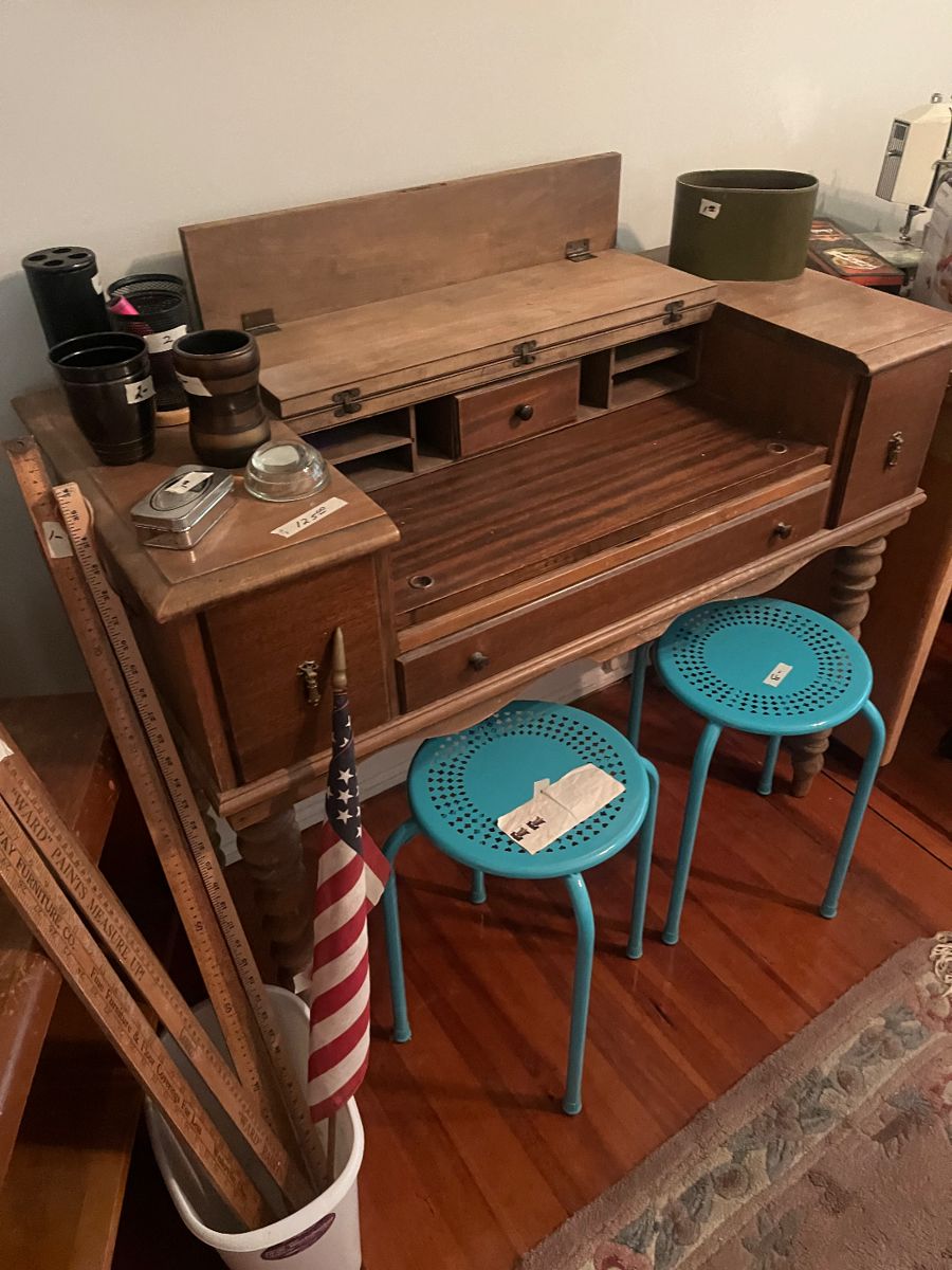 Elderly couple has moved from their home to move to Florida to be near their children. They have left behind the items they no longer need. It is believed that they never threw anything away. 3 sets of table chairs round oak table Birds Eye maple table marble topped Victorian chest about 29 small accent tables home office with desk, file cabinets, book shelves, office supplies and several printers, shredders and more kitchen with pots and pans, roasters, small electrics and more beds, chest of drawers, dressers and more clothing much original art, framed prints and more wall decor 3...