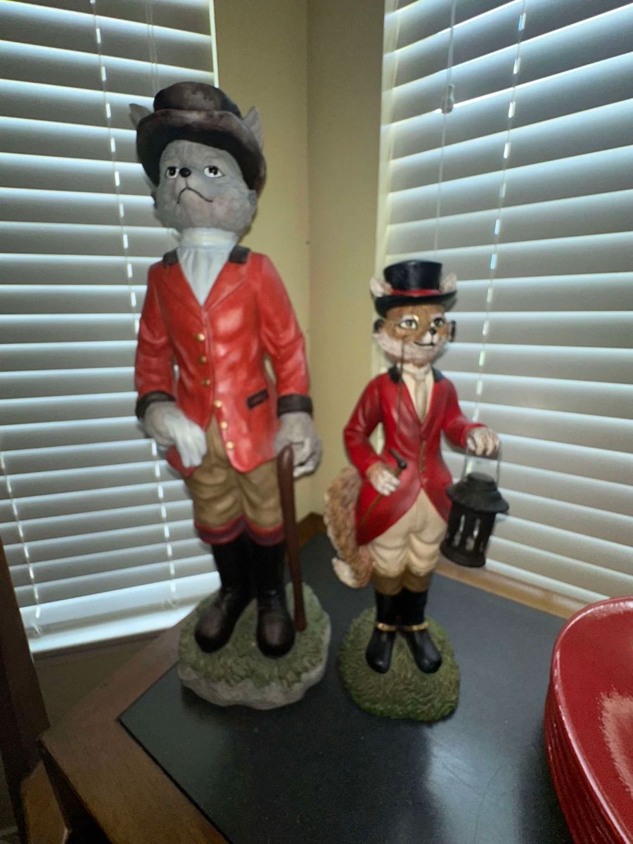 Please park on side of street opposite home ONLY. This sale has tone of cute Fox (and chicken) decor Costume jewelry Ceramic Christmas Tree Hand Painted Hurrican Lamp Anchor Hocking Tulip grease jar Luminarc France black stemmed champagne flutes 1960s CERA Fox and Hound hunt old fashioned glasses Chicken hamper Wilton vise Garage refrigerator Art glass rooster pitcher Mid Century Server, china cabinet, dining table with six chairs Pair rattan armchairs Iron bar stools with red cushions Yellow striped rattan sleeper sofa Antique white wicker chair and rocking chair Red and White upholstered ottoman Cane back vintage folding chairs Young...