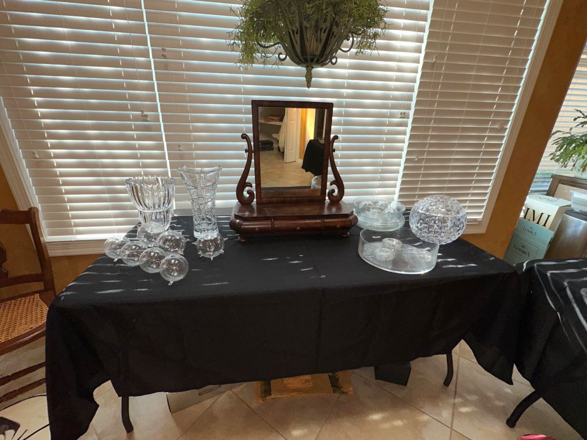 Pair of taupe leather electric recliners Royal Windsor by Towle sterling flatware (service for 10) Crystal decanters & pitchers Area rugs Oriental porcelain Tiffany & Co. porcelain rabbits Carved wood figurine Silver plated serving utensils Blow up mattresses Dawn Syracuse china Wall decor Decorative plates Wall mirrors Hutschenreuther Germany figurines Lladro figurines Heirloom by Oneida flatware set Small kitchen appliances Lodge cast iron Isaac Mizrahi china set King sized bedroom set (bed, 2 nightstands, dresser with mirror, chest of drawers, and armoire) Italian porcelain Cre Art Italy Holiday decor King Edward Gorham stemware Lady Ann Gorham stemware Millennium by Waterford...