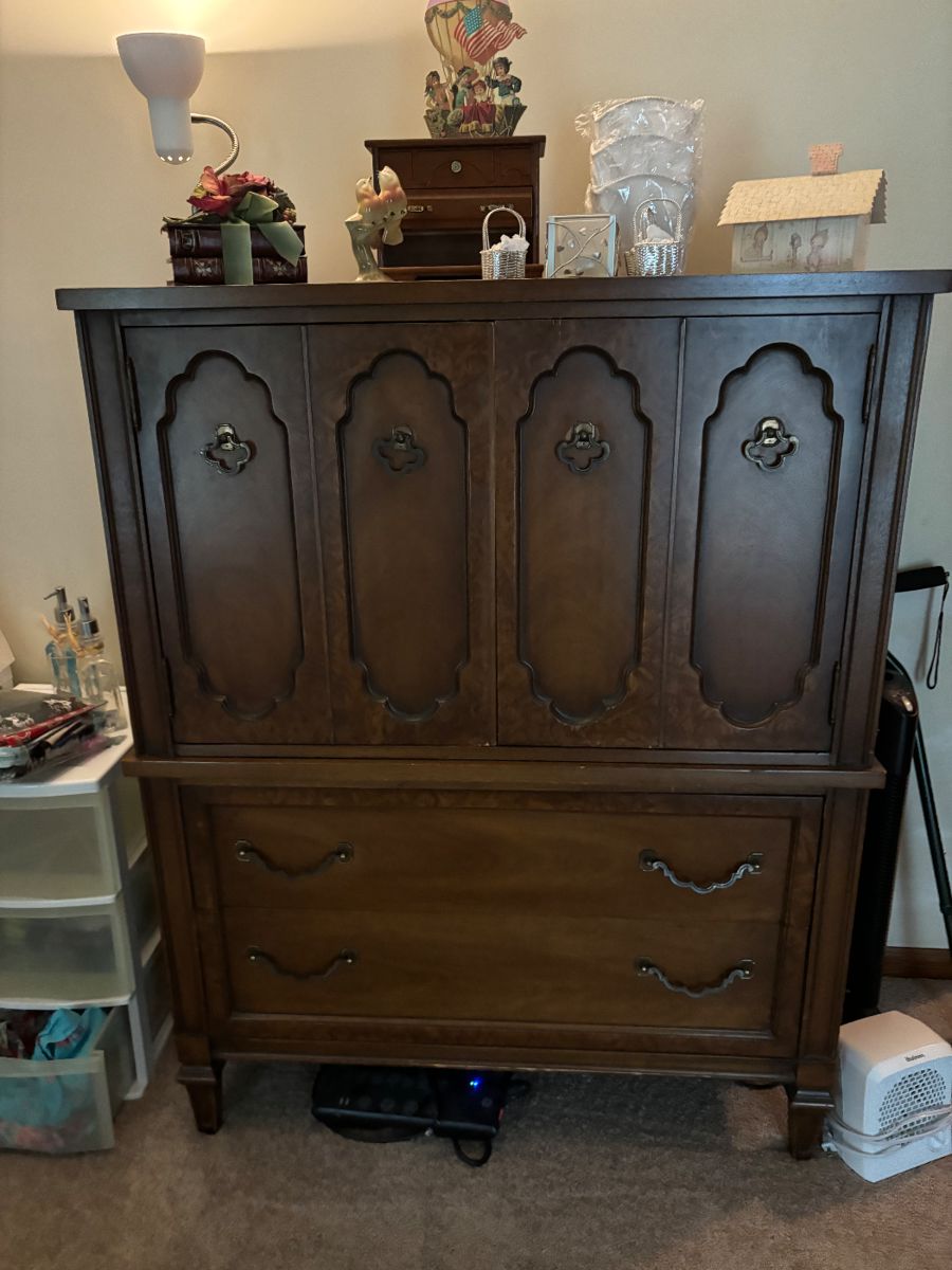 Lots of Christmas, flower pots, dining room table and chairs, secretary, dresser and chest, China cabinet, curio, odd chairs, frames, Corning ware, lamps, small trucks, old toys, and so much more
