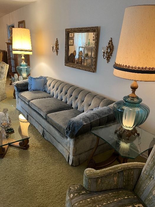 - Blue crushed velvet sofa and wing back chairs