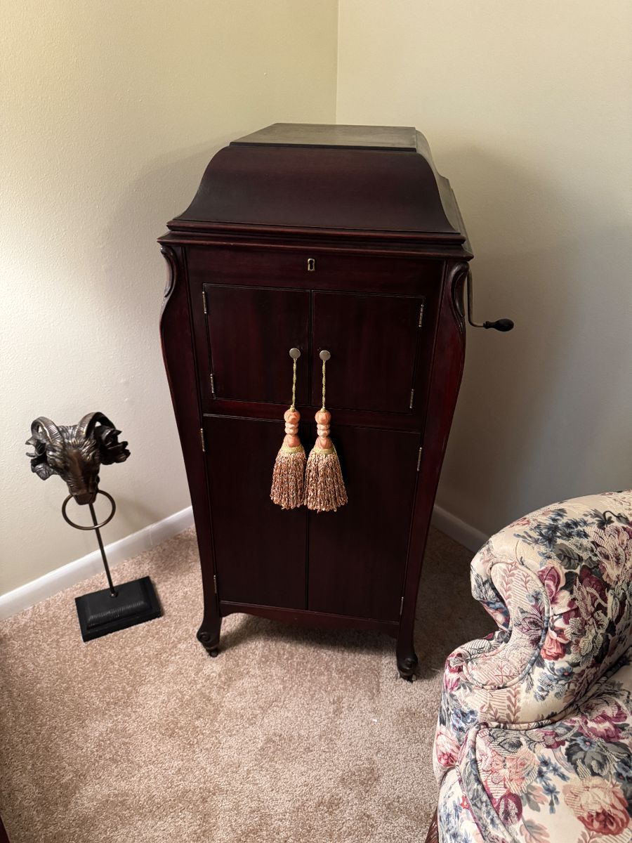 Antique Victrola Talking Machine, Oreck Vacuum Cleaner, Hoover Wind Tunnel Self Propelled Vacuum Cleaner, Ridgeway Grandfather Clock, Vintage The Bombay Co. Handcrafted Framed Rose Marie Antionette, Pati Bannister “The Rendezvous”, Floral Upholstered Arm Chair, Lane Butler Table, Pair Of Antique Marble Top End Tables, Pair Of Velvet Armchairs, Vintage Mahogany Drum Table, Neoclassical Style Table Lamps, Vintage Goebel Hummel Collector Plates, Vintage Secretary Desk, Chinoiserie Magazine Rack, Antique Rocking Chair, Pulaski Oak Dining Table & Chairs, Haviland Dessert Set, Handpainted Canister Set, Blue Cornflower Corningware, Spice Of Life Corningware, Mid Century Barstools, Solid Wood TV Table, Pair Of Resin Bronze...