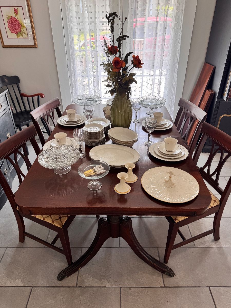 Duncan Phyfe Mahogany Dining Table & 4 Chairs, Noritake Ivory Fine China, Lenox Crystal Water Glasses, Hepplewhite Style Sideboard, Ruby Red Crystal Footed Goblets, UMS Captain’s Chair, Antique Upright Piano & Bench, French Neo-Classical Accent Table, Pedestal Dining Table & 4 Chairs, Gold Ornate French Round Mirror, Cottage Style Hutch, Lenox Urban Lights Fine China, Duncan Phyfe Style Drum Table, Green Upholstered Arm Chairs Pair, Vintage Amber Gold Wheaton Bulls Eye Tumblers, Imperial Glass Nut Brown Goblets, Vintage Libbey Amber Country Garden Daisy Flower Goblets, Godinger Shannon Crystal Footed Candy Dish, Cristal d’Arques Staiger Eventail Quartz Clock, Godinger Shannon Crystal...