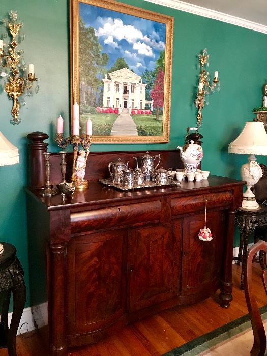 Queen Anne banquet dining table & 10 shield back chairs, Empire mahogany flame sideboard, 3 drawer French inlaid chest, tall antique replica ornately carved curio cabinet, Mahogany Queen Anne sideboard, 5 drawer marble top chest on castors, Empire mahogany jelly cupboard, pair of large Chinese carved tables/fern stands, plate collection including Faberge egg plates, Rococo parlor set with sofa, pair arm chairs & pair side chairs; walnut square breakfast table/turned legs, Dresden candelabra, antique china cabinet/claw feet, Herrmann large secretary, 4 drawer silver chest of drawers on legs, pier mirror & base, antique foot stools, 2 pair wall sconces, brass...