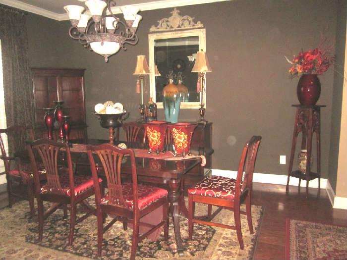 This home is full ! Schnadig down sofa, Empire vanity, 2 drum tables, fern stands, lots of decorator lamps (pairs & singles), mahogany dining table / 6 chairs, matching sideboard & corner china cabinet, Jamestown by Wabash Country French dining table with 6 chairs, ornately carved demi-lune table, jewelry cabinet on legs, lots of local art: Clark Walkers, Barbara Gallagher, Sharon Yavis, Nan Cunningham, Mose T, plus other art; large pedestal with glass top breakfast table/ 4 Parson’s chairs, pair of swivel matching chairs, pair of designer bar stools, Husqvarna-Viking designer Topaz 50 sewing/embroidery machine in like new condition, small...