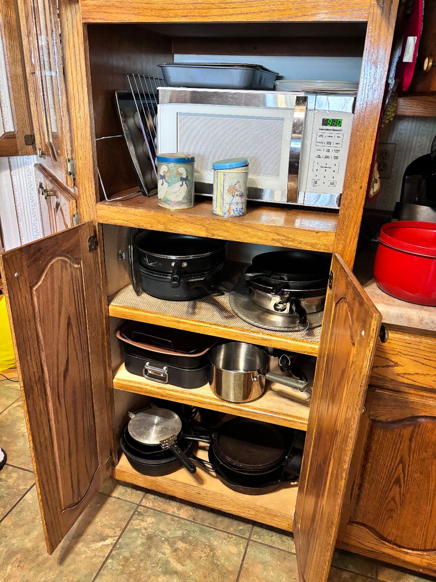 3-leg cast iron pot, wood trunk, electric stove, refrigerator, solid wood bedroom set with full/queen size headboard, footboard, wood rails, dresser with hutch mirror, chest of drawers, riding lawn mowers, igloo style doghouse, weed eaters, leaf blowers, garden and hand tools, ladders, push mower, tiller, microwave, pots/pans, dishes, small appliances, pink Gone with the Wind painted lamp, washer/dryer, baker’s rack, vintage spoon collection, Leather-look sofa with matching chair, solid oak dining table & 6 chairs with matching china cabinet, Beautiful handmade quilts, wood Queen Anne coffee with matching end tables, teapot collection, beautiful mahogany wood hope chest, barrel back vintage...