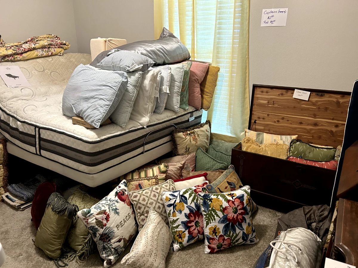 Bar stools, recliners, framed art work, new small appliances (in original packaging), new linens (in original packaging), dishes, glasses, serving platters, cookware, fiestaware, tea pots, home decor, antique furniture - dining table, vanity, desk, trunk, dresser, adjustable bed-, loads of Christmas decor, lots of books, floor steamer, vacuum, cleaning essentials, like new white bedroom set, grill and grilling tools, lots of wicker baskets, lots of rustic metal serving/party essentials, tools, ladders, shop vac, ladies clothes and shoes, office supplies, arts and craft supplies, washer and dryer, side by side kitchen refrigerator, and much more!!