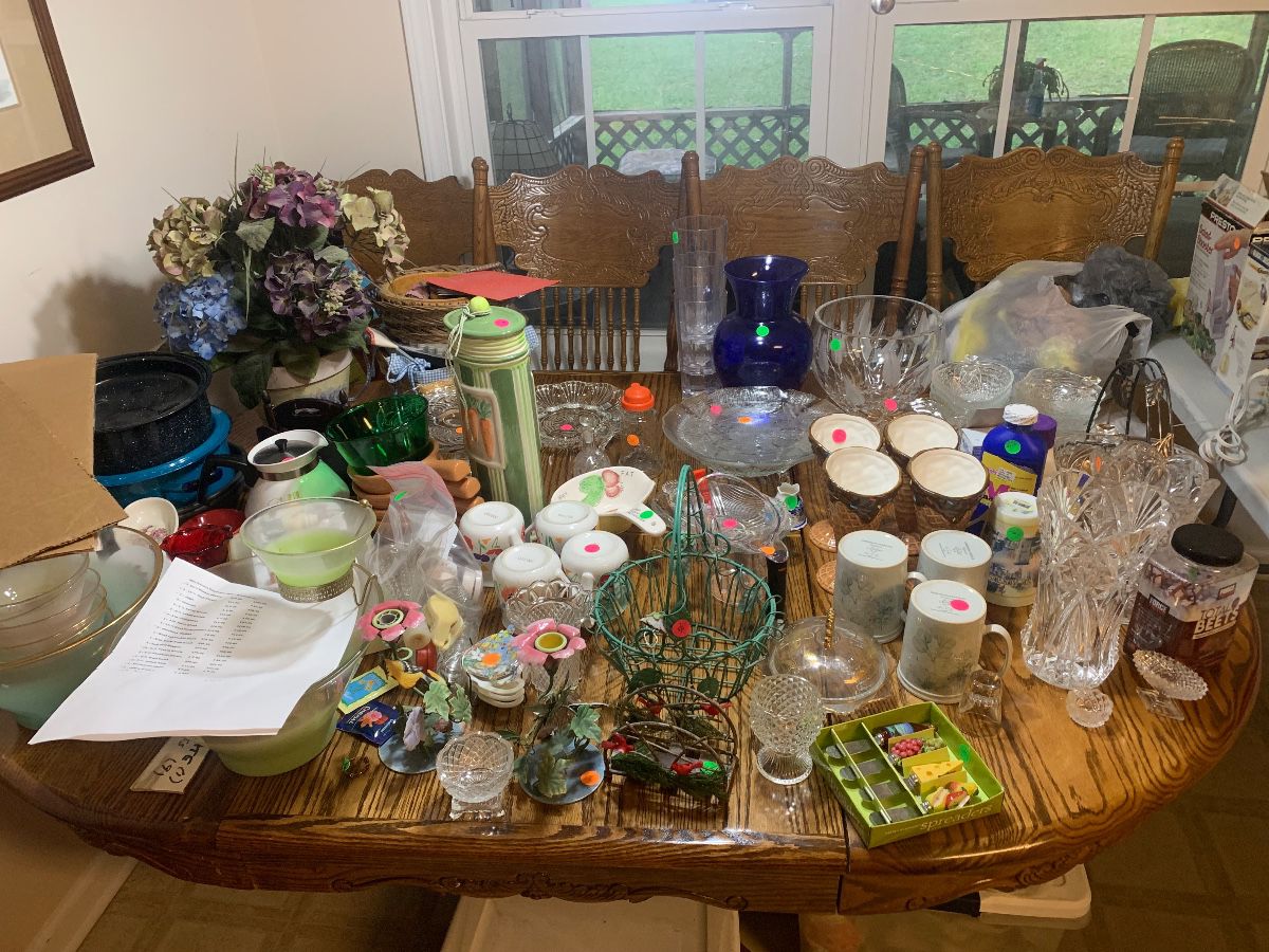 You will find living room furniture….dining table and chairs….some bedroom furniture and exercise equipment. Vintage glassware including Candlewick, Miss America and more. Dinnerware….flatware and small kitchen appliances. Some linens….lamps….home decor and tv’s. Women’s clothing and shoes. Hand tools…power tools….tool boxes…..fishing and hunting items and push mower. An adult tricycle and bicycle.