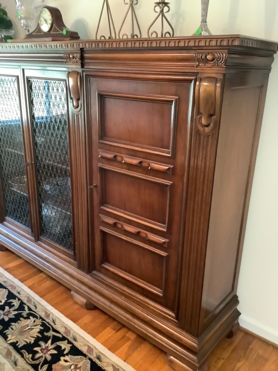 * Furniture : Striped couch and matching chair in burgundy, beige and green, excellent condition, oak square table with burl legs, metal round coffee table with marble like top in browns, 2 matching end tables, mahogany table with drawer and matching mirror, child’s school desk, Mid Century chest like with drawers, from France, handmade wood rocker, very beautiful and unusual, has matching end table, 3 piece oak entertainment center with glass doors, glass shelves with lights, center has glass doors, drawers and place for flat screen TV, 2 wing back chairs with beautiful flower designs in green, blue and rust,...