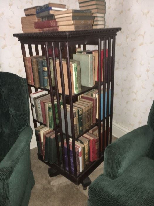 Nice selection of unique antique, primitive furniture and outdoor equipment just in time for Spring. Bowed front China cabinet with claw feet Table with 6 chairs, matching buffet and matching chest cabinet Wide mirror with etching and unique carving Small secretary with wood lattice over glass Three sectional room divider Rare Rotating Bookcase Small chest of drawers Several small tables for multiple uses Nice round Duncan Phyfe side table Wide cedar chest with sea shell ornate décor Pair of green swivel upholstered rockers Wood magazine rack Large steamer trunk Hall tree with storage seat mirror, hooks, and carved face on...