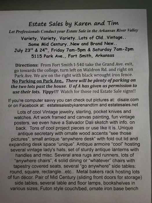 Estate Sales by Karen and Tim Let Professionals Conduct your Estate Sale in the Arkansas River Valley Variety, Variety, Variety..Lots of Old..Vintage.. Some Mid Century.. New and Brand New.. July 23 rd & 24 th, Friday 7am-5pm & Saturday 7am-2pm 5115 Park Ave., Fort Smith, Arkansas Google Pictures Flickr Pictures Directional Map disale.com Directions: From Fort Smith I-540 take the Grand Ave. exit, go towards the college, turn left on Waldron Rd. and right on Park Ave. We are on the right with black wrought iron fence. No Parking on Park Ave.. There will be plenty of parking on the...