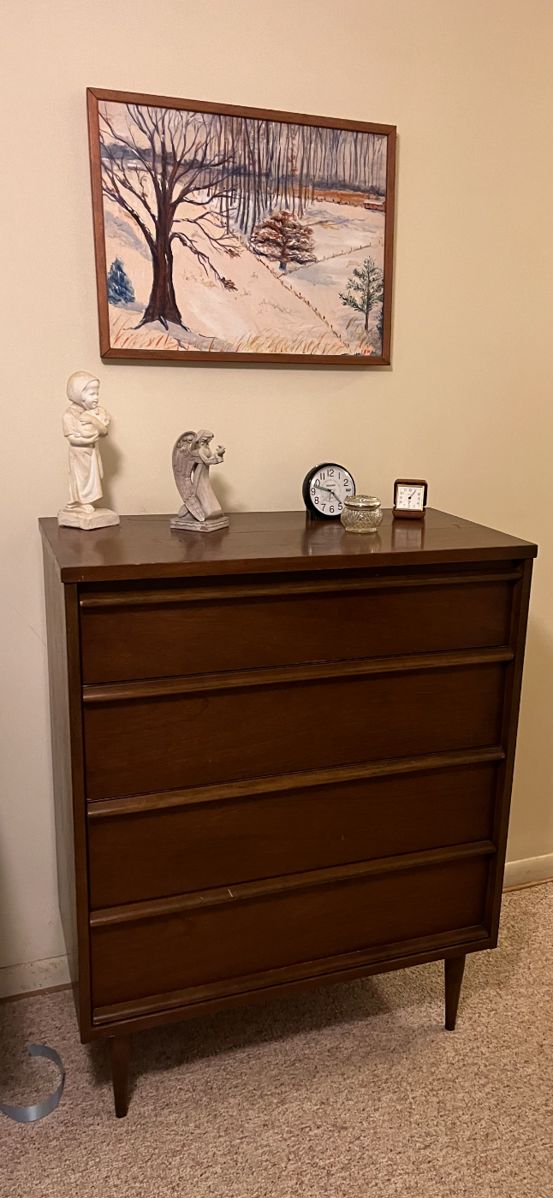 Sale includes power recliner, student roll top desk, stereo cabinet, mid century end table and coffee table by Mersman, pair of lamps (custard glass color with gold design) stereo system by Sony, turntable, stereo rack, crock pot, like new washing machine by whirlpool . Amanda dryer, 4 wicker seat dining chairs, oval oak dining table, China, asst. glassware, set of commutative pewter and glsss plates. Microwave and stand, tupperware, Corning, Pyrex, appliances, copperware, mid century walnut chest of drawers, luggage, 2 rocking chairs, mid century bed (full size) matching chest of drawers and dresser with mirror, maple night stand 2...