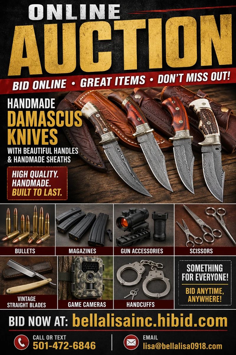 Join Us for a Spectacular Auction : Blades & Ballistics: Handmade Damascus Knives, Bullets, Magazines, and More Discover the craftsmanship and power behind this unique online auction featuring an impressive collection of handmade Damascus steel knives paired with a wide assortment of ammunition and magazines. This sale showcases a large quantity of beautifully crafted Damascus knives, each one featuring distinctive layered steel patterns and eye-catching handles. From bold, colorful resin designs to natural wood finishes, these knives are as much works of art as they are functional tools. Many pieces include custom sheathes, completing the look and making them ideal...