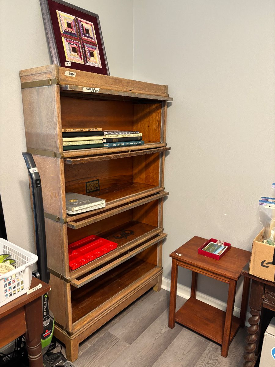 TODAY MOST ITEMS 50% OFF!!!! Estate Sale, contents of a very nice home!. Unusual antique oak curved glass china cabinet,Old punch tin pie safe, Oak stack bookcase, barley twist oak desk, Awesome sewing machine collection including Husqvarna Viking machine with accessories and booklets, Bernina, Janome New Home and Horizon machines, and antiqueSinger treadle as well, quilting books, quantity of pressed and brilliant cut glass, Waterford, cranberry, crystal, contemporaryPottery, large paperweight collection, walnut tables, footstools, day bed, bookcases, holiday, marble top table, blanket chest,Cherry poster bed with vanity and stool, drop leaf bedside table, flat screen TV, Victorian Davenport desk, bookcases,...