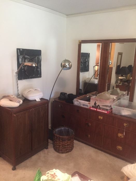 Estate Sale, home is packed with lots of mid century and contemporary furnishings! Contemporary oak dining table, chairs, and china cabinet, leather and upholstered chairs, neat bar w/leather top, antique tables and chair, small tables, painted chest, neat mid century artwork, mirrors, prints, crystal, china, glassware, collectables, and pottery, mid century dresser, men's chest, and end tables, game table and chairs, bookcases, several dark oak chests and desk, awesome lamps, unusual grandfather clock with radio and 8 track player (works!) oriental panels, lift chair, jewelry cabinet, oak entertainment cabinet, linens, rugs, kitchen and household, retro Hoover vaccum, corning ware, ruby...