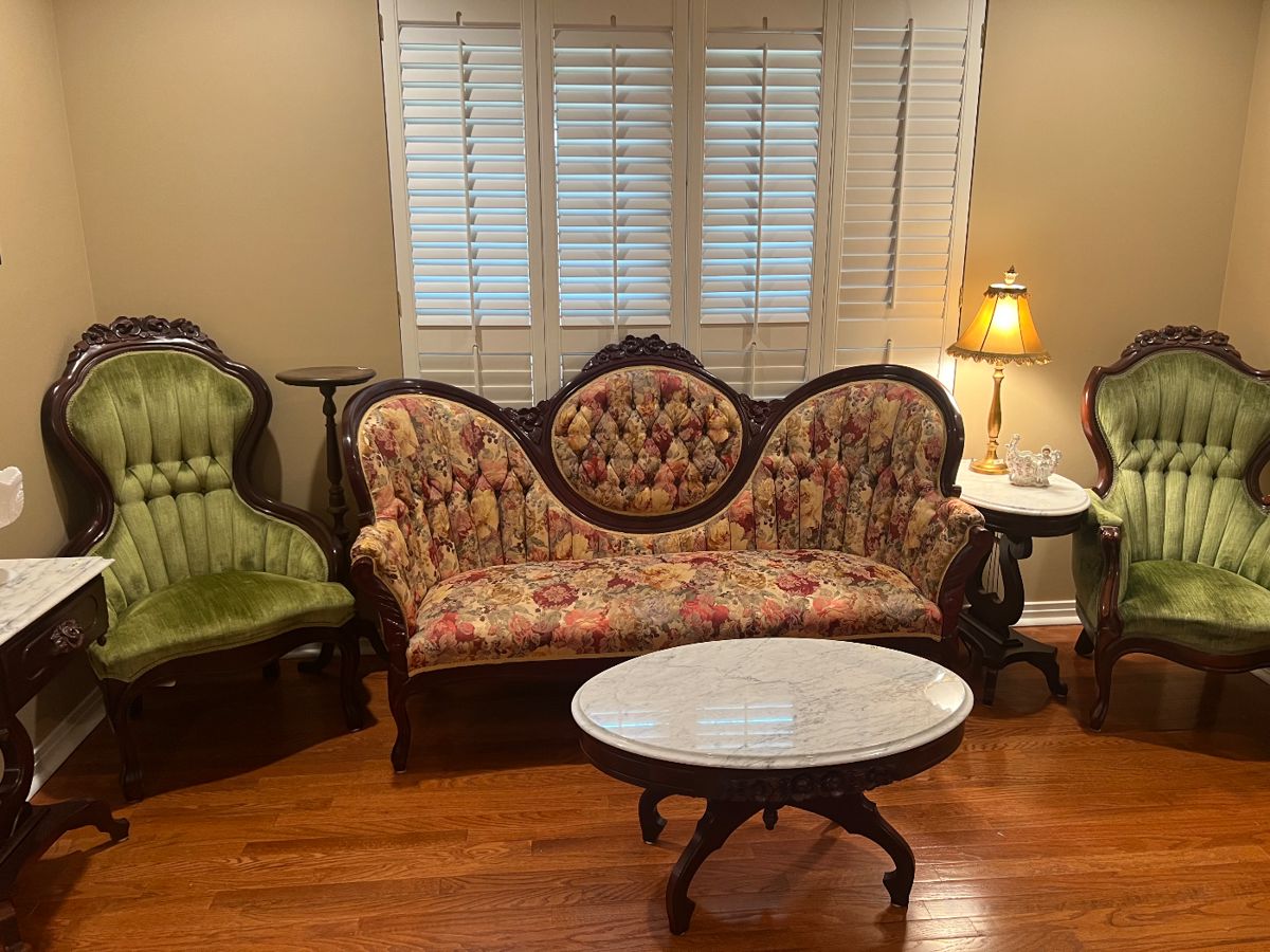You cannot afford to miss this sale!! (Part 1) Mahogany buffet, Dining room table and six chairs, Victorian sofa with Lord and Lady matching chairs, marble top end tables and marble top coffee table. Extra large gold mirror, piano bench, gate leg table, magazine rack and plant stand. China cabinet and square glass top and bottom coffee table. Two oak bar chairs, leather top side table, two attached wooden Levy School bench seats, child's rocker, side tables, feather lite Singer sewing machine, Mid Century Modern cabinet with vintage sewing machine, antique sewing chest, Lane cedar chest. Oak book case, several...