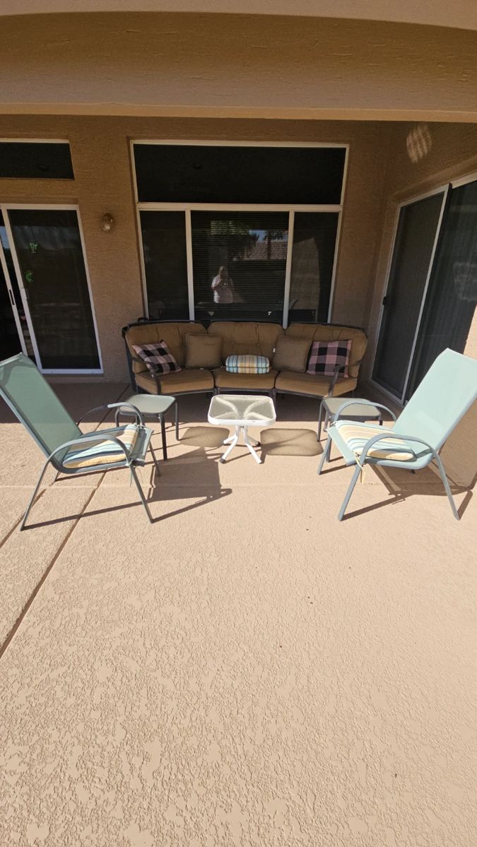 This house has a round patio table with chairs, cast aluminum curved outside sofa, two patio chairs, three patio and tables, queen size bed, loveseat, recliner, area rug, farmhouse style kitchen table, hutch, and butcher block style table, 2 solid oak bar stools, Sofa, desk, tvs, TV stand, metal garage shelving units, golf clubs, some tools, Linens, some women's clothing and women shoes, kitchen items and Garage items.