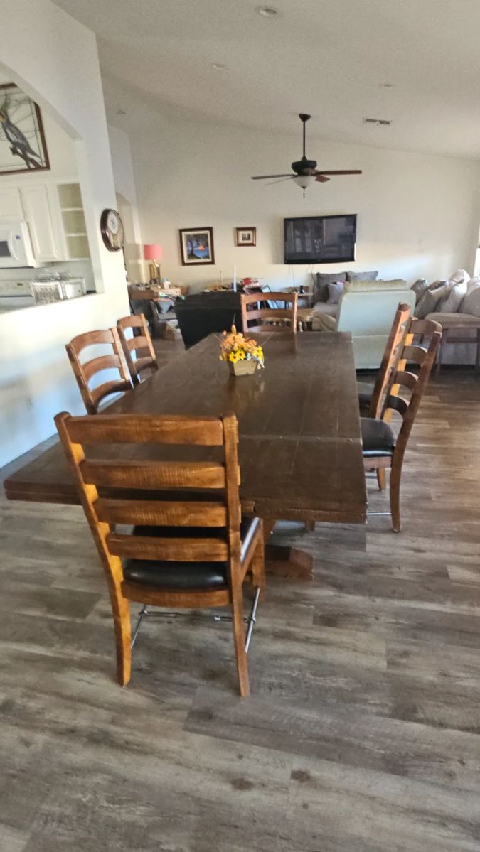 This week's sale house has some great finds including lots of musical clocks, sports memorabilia, A Plush sofa, two cream power recliners, a gorgeous purple Decor chair, a huge farmhouse style dining table with eight chairs, end tables, a daybed, marble top vintage dressers, to display cabinets, and antique secretary desk , lots of brand new cleaning supplies, a little bit of kitchen, a little bit of clothes, and some Garage items.