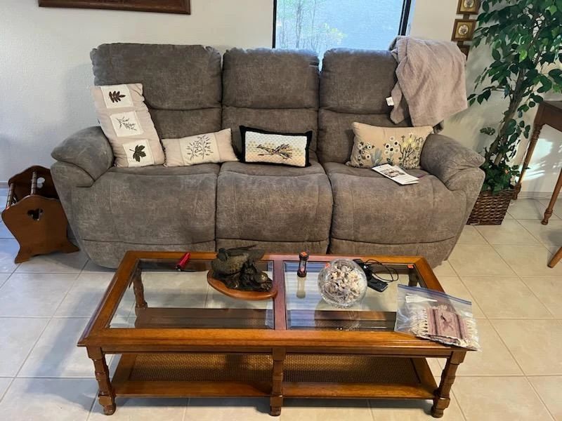 Beautiful home in Green Valley filled with lovely southwestern art and well kept furniture. La-Z-Boy upholstered swivel rocker purchased 3 years ago LaZ-Boy Trouper gray sofa with built in recliner. Also purchased 3 years ago Several small occasional tables, most are vintage and are solid wood Many lamps, a couple are floor lamps, most are table lamps Wall art includes metal art, embroidered pieces, and several painting including one by Lots of craft items, and a nice cabinet to store craft items Women's clothes, most size L and XL. Women's shoes size 9