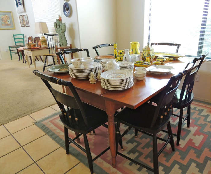 2 Twin bed sets, Vintage pine dining table with Hitchcock chairs, collectible french, Italian and Mexican pottery and lots more.