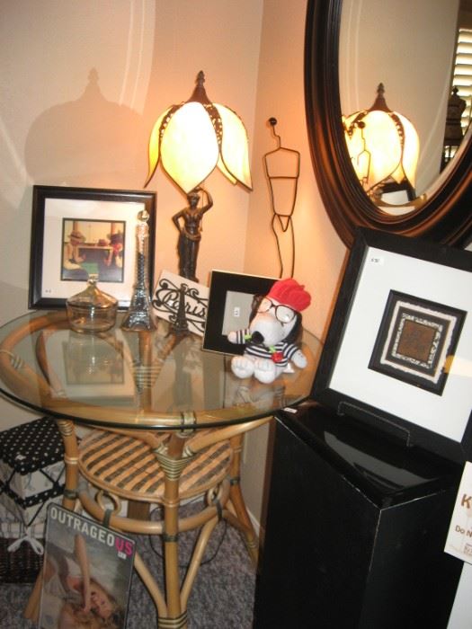 Large square coffee table with drawers; art prints (framed & unframed); butcher block cabinet; SW yard art; some collectibles;King mattress set; four post king bed; Bedroom furniture; wood-back sofa; small black desk; some SW items; lamps; books; sofa table; display cabinets; patio furniture; curtains; some tools;Black glass-door display cabinet; wall mirrors; dining chairs; much household items. This is a full house.