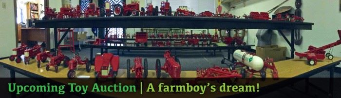 The collectible toy auction features many, many die cast toy tractors, some in boxes and some with impletments - ERTL McCormick Farmall amongst others. Also, trains (Lionel, American Flyer), Barbie, Hot Wheels and much more. See our website for both auctions running now and call us with any questions. This auction runs online through Sat. Sept. 24th webcast/live portion begins on the 24th at 9:00am. We have in house shipping for out of town bidders.