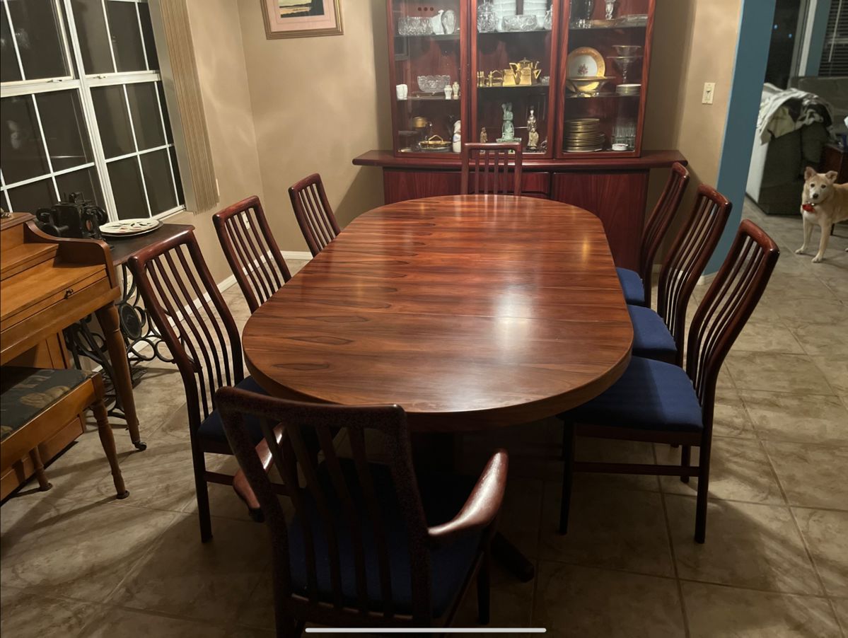 Art, stained glass in the fashion of Frank Loyd Wright. STUNNING mid-century teak (or possibly rosewood) dinning table with 8 chairs. Mid-century hutch, teak (possibly rosewood). Large gold plated dish set made of both glass and porcelain. Limited lithograph of Churchill, by his descendant. Gorgeous oak dresser that has been stripped. Plus large hat collection in excellent condition! 3 stunning antique mirrors from Scotland dating back over 150 years in the family. Gorgeous antique quilts. Household tools. Puppets with puppet stage. Blue glass, ruby glass. Hand carved Asian sculpture. Antique and vintage dresses in excellent condition. Don't miss out on...