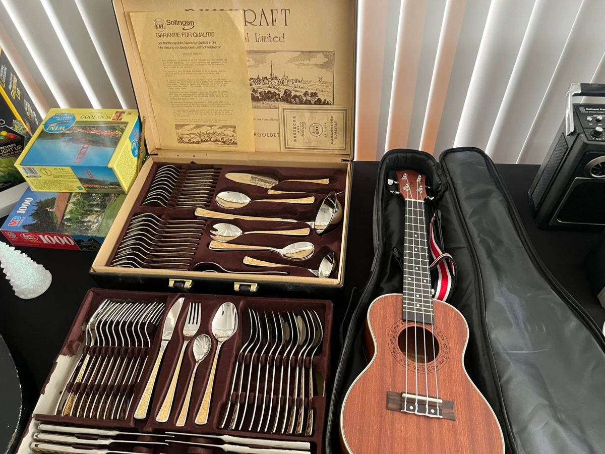 We're selling a lot of things that might interest you. Ice machine, dining set, TV, kitchen items, tools, clothes, shoes, some antique items, lamps, nightstands, sofa beds, rocking chairs, computers, electronics, camping chairs, lots of electronics, travel suitcases, and more.