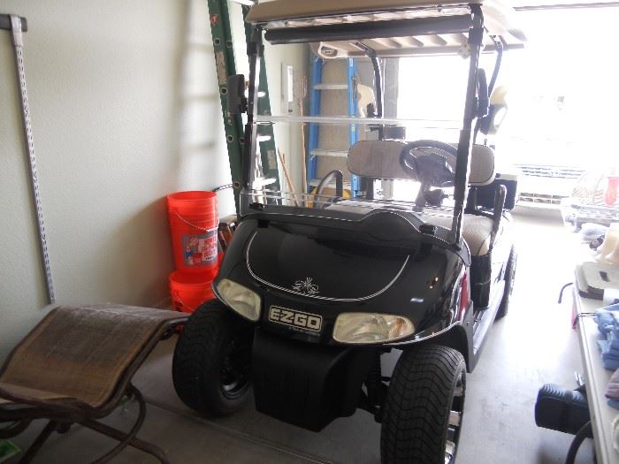 THIS SALE WILL NOT BE OPEN ON SATURDAY! 2008 EZ Go golf cart with charger has been added to the sale. Nice sale! Fender Gemini guitar. GE side x side black refrigerator with water feature in door. Large vintage cedar chest. Leather sofa. Pushback recliner. Occasional chairs. Small round fringed ottoman. Two round end tables. 17” wide curio. Floor and table lamps. Decorative wall clocks. Decorative mirrors. Pictures/wall art. Dining set with four chairs and one leaf. Rolling side cart. Queen bed with headboard and mattress/box springs. Triple dresser with mirror and two matching night stands. King bed with headboard,...