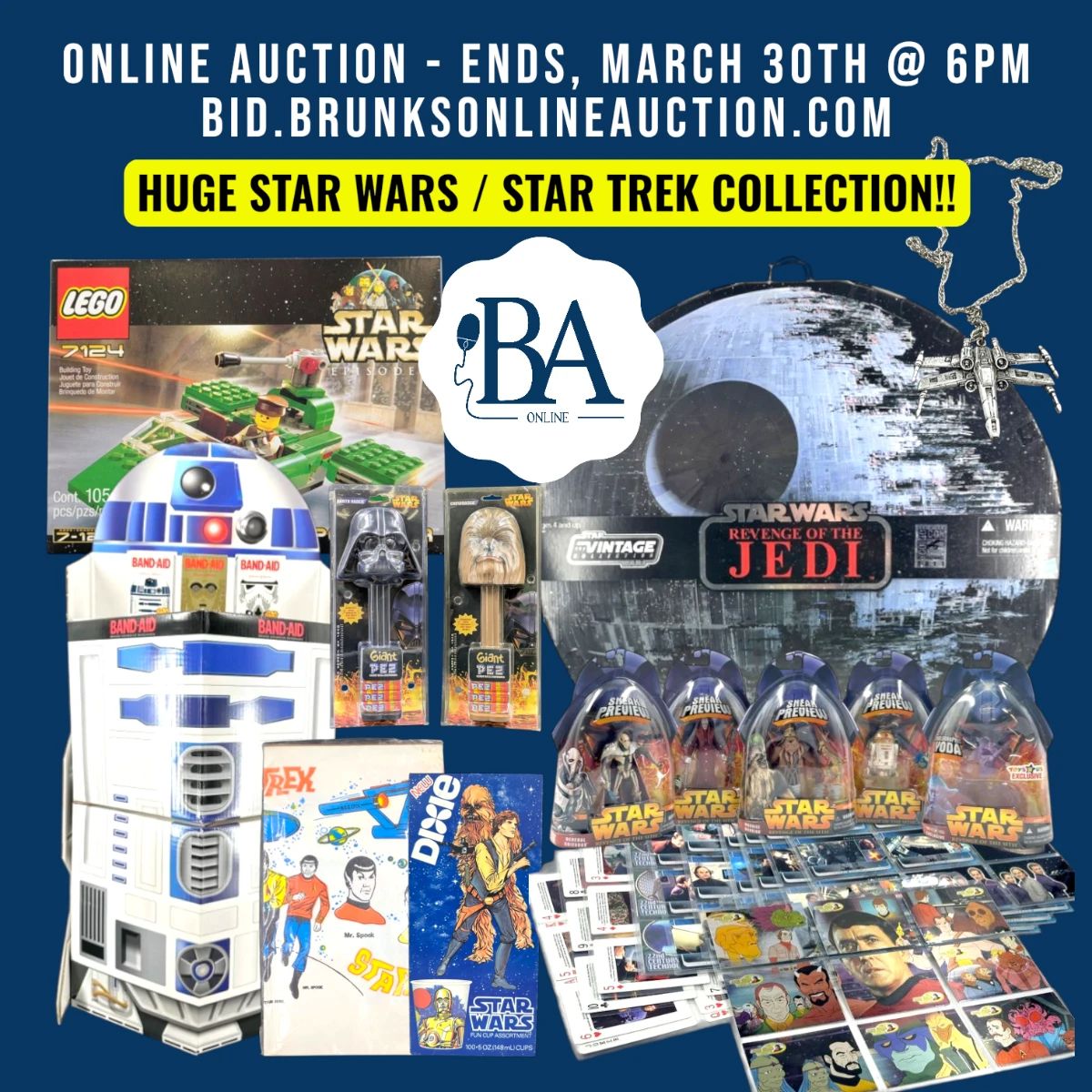 BA056 - STAR WARS MEGA AUCTION (PART #1): Galaxy of Collectables ​ Brunks Auction is honored to present the first offering from an extraordinary lifelong collection of Star Wars, Star Trek, and sci-fi memorabilia assembled by a passionate private collector from California who began collecting in the early 1970s. Built purely for the love of the hobby and never as a business, this remarkable collection contains tens of thousands of items with no duplicates and represents more than $250,000 in investment. Widely respected within the industry, the collector was known for the size and quality of his holdings, even earning...