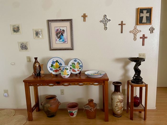 Large Collection of Storytellers, Chickens, handmade wooden whirlygigs, art, southwestern table and 4 chairs, console table, Yamaha keyboard and lots more!