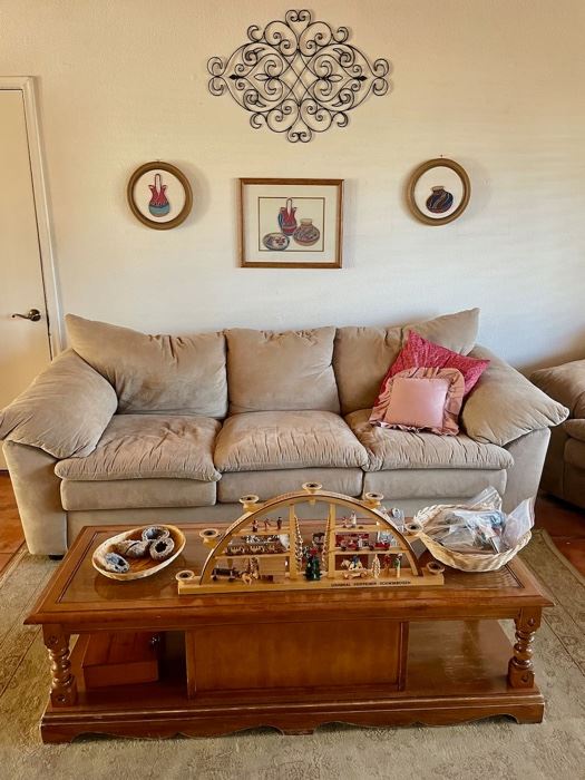 Ultrasuede sofa, loveseat and recliner, lots of baseball cards, books, tools, yard art, weight set, and lots more!