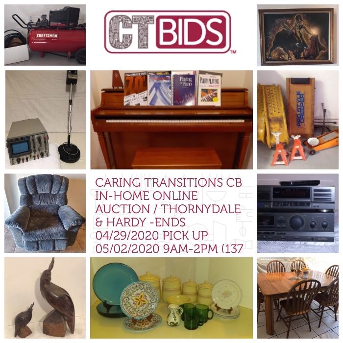 CARING TRANSITIONS CB IN-HOME ONLINE AUCTION / THORNYDALE & HARDY -ENDS 04/29/2020 PICK UP 05/02/2020 9AM-2PM Fine furniture, Fun & Functional Decor, Tools, Electronics... something for everyone! Bid now at https://ctbids.com/#!/storeDetail/26 Important COVID-19 NOTICE: Auctions pickup times will be strictly enforced to ensure low/no contact and small groups are gathering in line with CDC recommendations. We are operating in accordance with State and local official’s guidelines and we thank you for your cooperation in keeping everyone safe and healthy NOTE: REDUCED SHIPPING AND DELIVERY RATES ARE AVAILABLE NOW for those that are sheltering in place. Bidding starts at $1.00 with...
