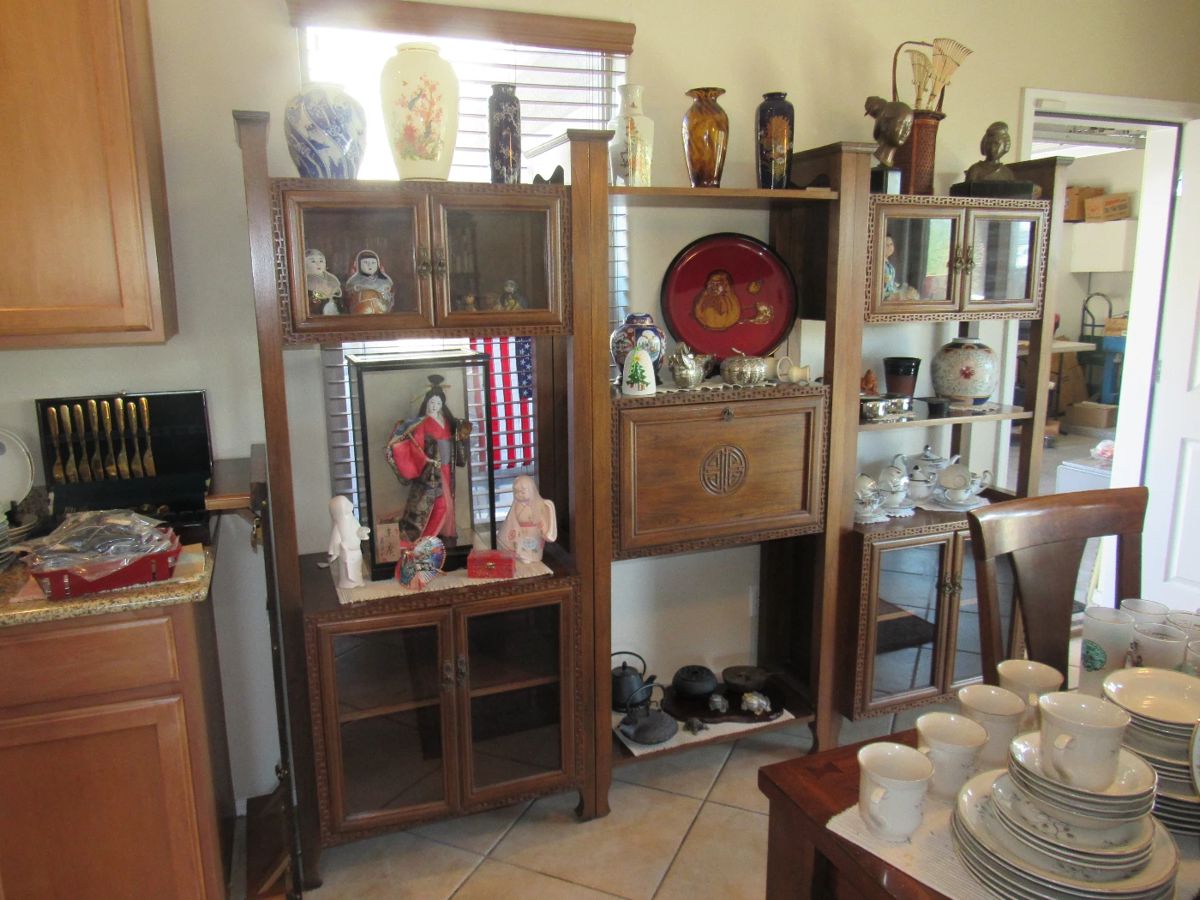 This beautiful Eastside home has many, many Wonderful treasures that are in need of a new place to call home! Please take a moment to view the photos on our website of all of the things that we have to offer, as it is impossible to list everything! Some of the items include but are not limited to… Sofa, pair of wood Asian end tables and coffee table, TV stand, books, pillows, 1950s pair of mid-century lamps with rotary switch, vases, TV, pictures, sports cards, office chair, Asian rosewood china cabinet, a nice selection of blue and white dishes, oriental...
