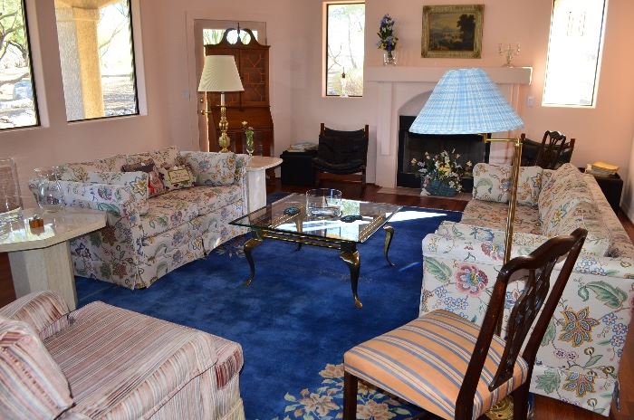 Expansive home FULL of Special items that make great gifts! Silver! Crystal! Holiday Decor! Don't miss out! This gorgeous foothills home is also going to be for sale with Russell Long of Long Realty! Notable: Small amount of jewelry, sterling silver serving ware Living Room Sofa table Hutch Secretary Wood and black leather chairs with ottoman Rug Floral couch and love seat Art 2 high back chairs Marble like end table Brass and glass coffee table Lamps Bar Glassware Wine cooler Bar utensils Dining room Dining table (wood) with 4 chairs Rug 3 hutches Plated silver Rogers and son plated...