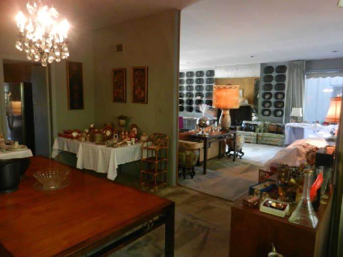 Mid Century Asian motif furniture & furnishings traditional '60s garden Buddhas and Japanese stone lanterns in a classic old Beverly Hills setting just off Benedict Cyn. Property is part of the former estate of Buster Keaton, purchased by actor James Mason and his wife Pamela, and sold to the current, but now-deceased owners in 1955. This time capsule contains original vintage items including oversized enameled Asian ceramic lamps, spectacular hardstone mid-century Japanese screen, Baker dining table with three leaves, mid century case goods, original/reproduction art by Magritte, Sisley, etc.; whimsical collectibles from the hey day of great Las Vegas hotel...