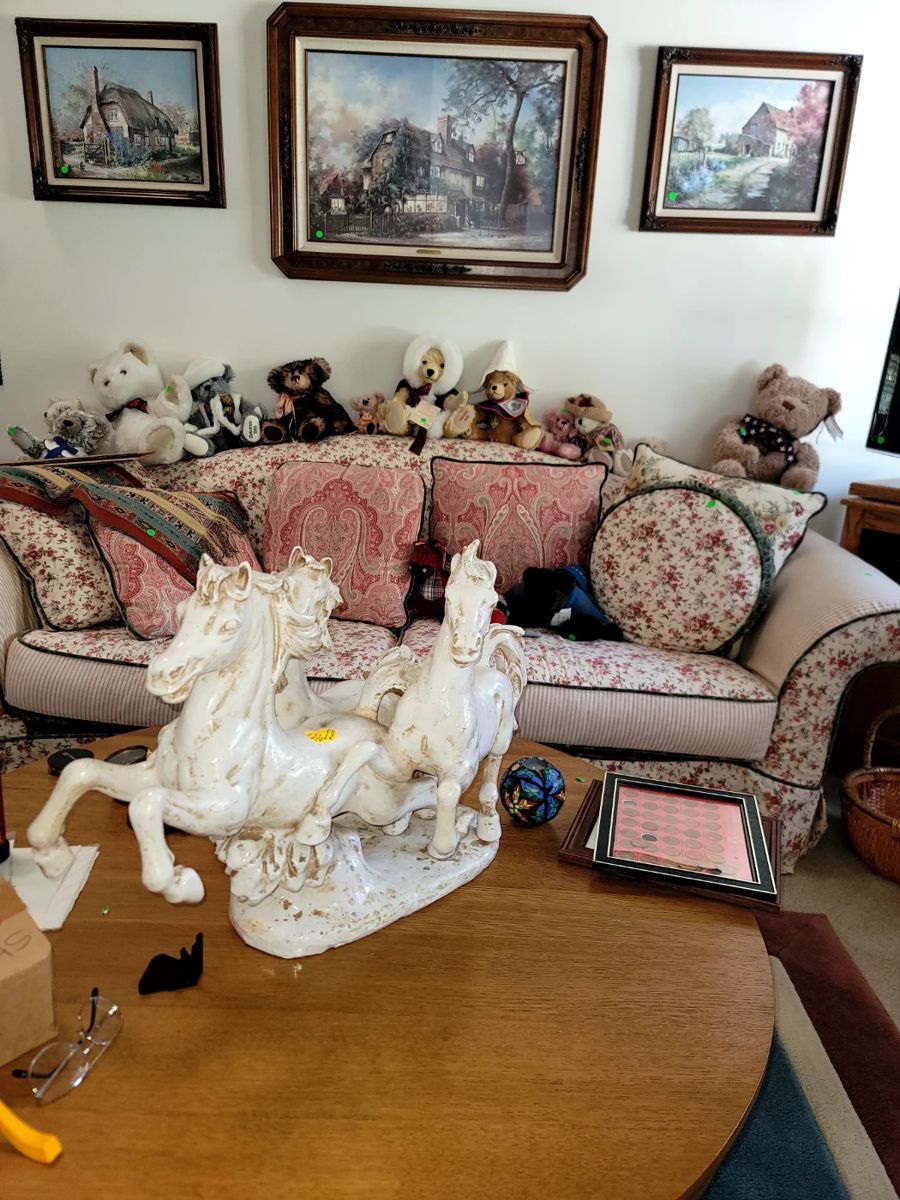 Hello Folks: This is one of those sales you will get lost in. There is 8000 sq ft between the house, front yard, backyard and a secondary yard through the gate. Everything in this house and yard are priced to sell. We do not want to keep anything. Thomas Kinkade, Marty Bell, Jim Gray, Native American art, Native American pottery, antique clocks, mid-century modern furniture and lamps, Fenton lamps Fenton Crystal Wedgewood, vintage and antique Banks, miniatures including sterling silver Sacchetti, real wood Miniatures and Japanese miniatures, Mexican pottery Italian pottery colored crystal Steinbeck nutcrackers, longaberg baskets tons of yard...