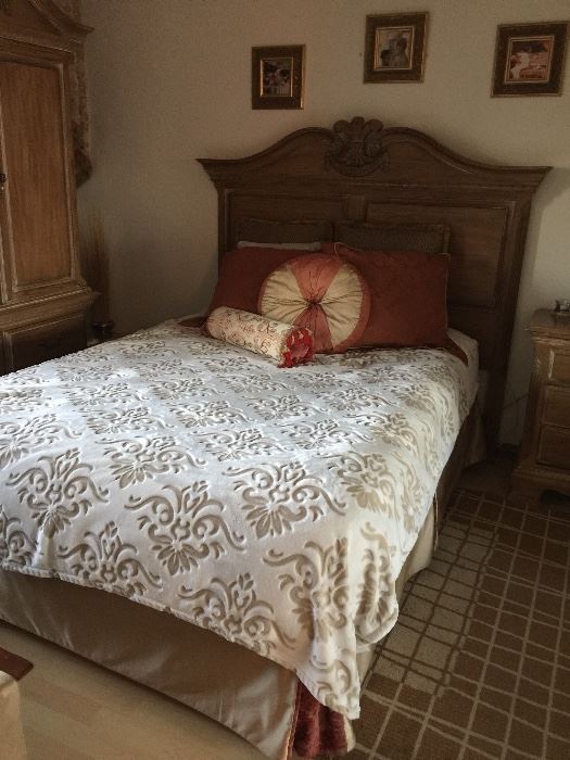 Beautifully Decorated Home by Hawkes & Smythe Interiors! Decorative Solid Wood Full Size Headboard. Three Drawer Ash "Lexington" Nightstand. Grecian Style Table Lamp and Shade. "Lexington" Ash Decorative Armoire with Three Drawers for Storage. Dark Walnut Occasion Table with Carved Legs and Front Drawer. Metal Wire and Rattan Newspaper/Storage Basket. Small Two Shelf Bookcase. Beautiful Ornate Framed Artwork (two sisters.) Gilt Gold and Burgundy Scrolled Design Wall Mirror. Hand Painted Cabinet with Metal Hardware. Unique Black and White Striped Cushion Egyptian Revival Style Parlor Chair with Gold Gilt Lions Head Arm Rest. Hand Painted Japanese Garden Scene Wall Clock. Four...