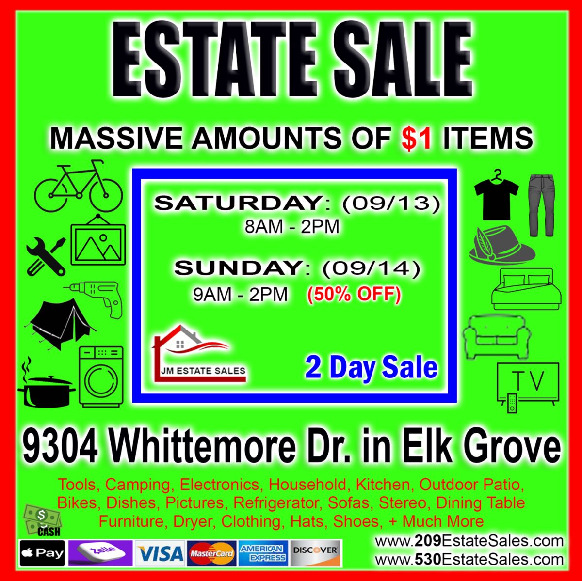 Estate Sale in Elk Grove Saturday 09/13, 8-2 Sunday 09/14, 9-2 (50% off) * Tons of $1 Items * Vintage Clothing $1/$5 fill-a-bag * Sofas * Refrigerator * Jewelry * Electronics * Stereo System * Cherrywood Dining Table * Kitchen Table * Wine Refrigerator * Hand Tools * Power Tools * Boxes of Nuts, Bolts, Nails, Screws & Washers * Bicycles * Camping Items * Book Shelves * Office Desk * Dressers * Beds * Knitting/Sewing * AE-1 Cannon Camera * Kitchen Appliances * Glassware & Dishes * Patio Furniture * Vintage Encyclopedia Set * Pictures + Much More! 8am...